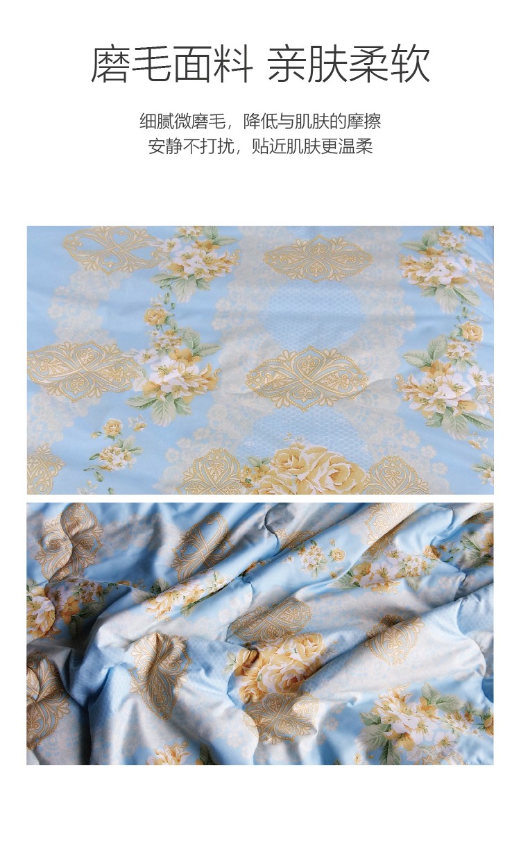 描述:磨毛面料亲肤柔软细腻,降低与肌肤的摩擦,贴近肌肤更温柔,优质大化成型防羽棉纤细柔长,不闷热轻柔软,没有重压感 ,采用科学的磁粒排布,产生立体磁场让全身沐浴在磁场中,补充身体能量。优质染料印染印花图案精致灵动水洗不易褪色,色彩清新耐看