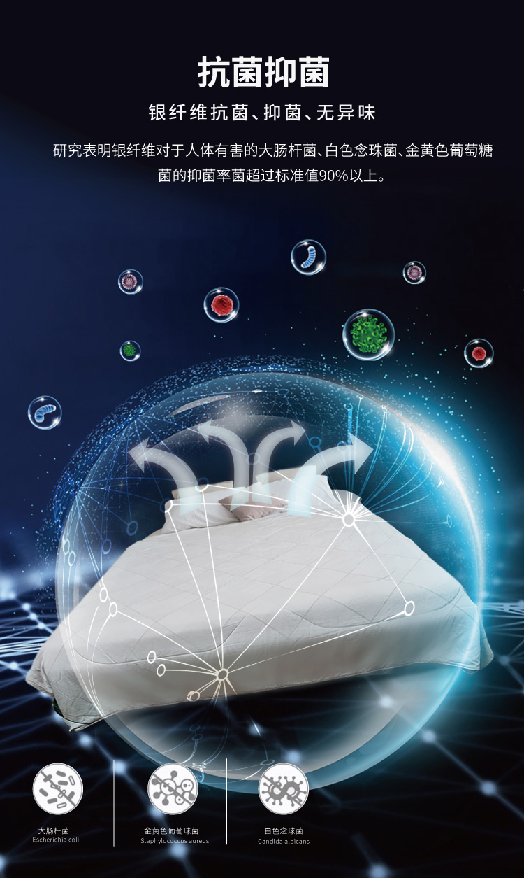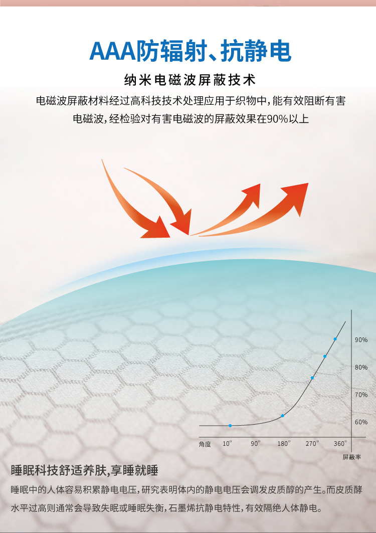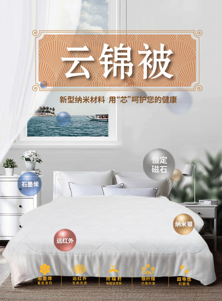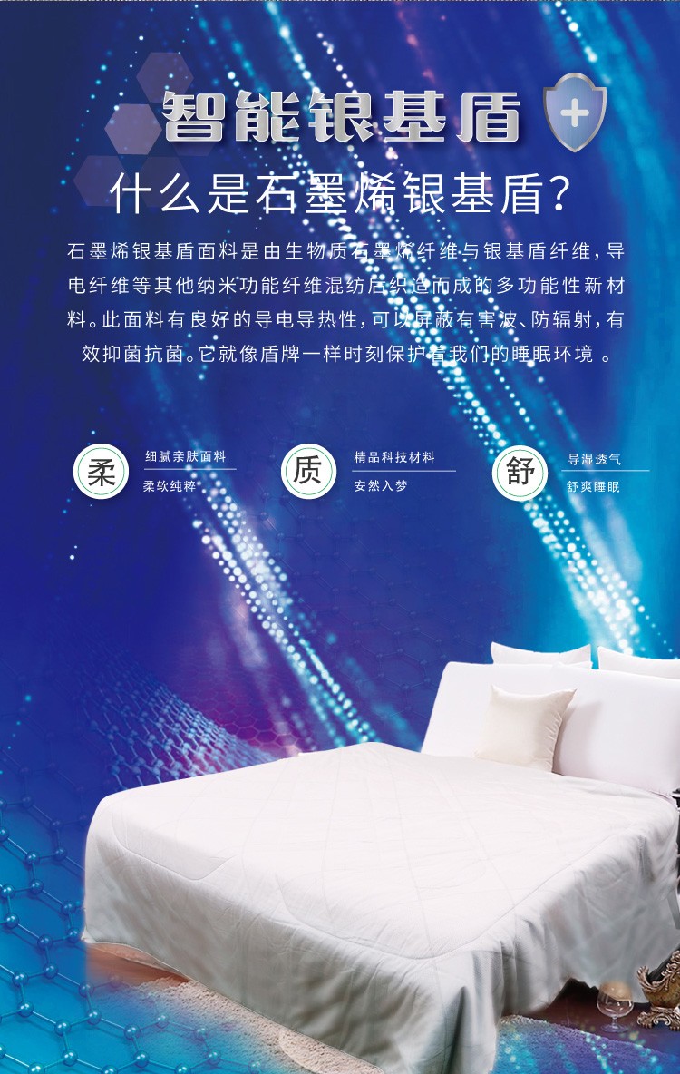 描述:具有石墨烯蓄能发热.远红外生命光波,防辐射电磁波屏蔽,银纤维抗菌抑菌、超导性抗静电等功能,全面呵护您的睡眠健康,带给你云一般的舒适体验。