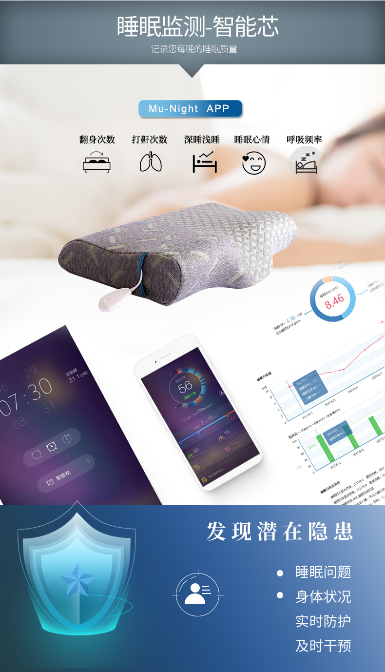 功能:1、学习娱乐2、负离子促眠3、生物磁4、震动按摩5、慢回弹记忆填充棉6、石墨烯智能发热片7、智能闹钟8、音频助眠9、睡眠监测10、防螨特卫强