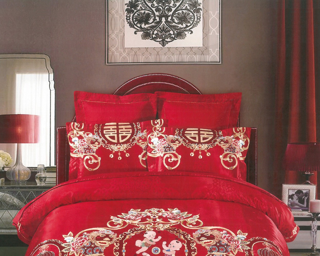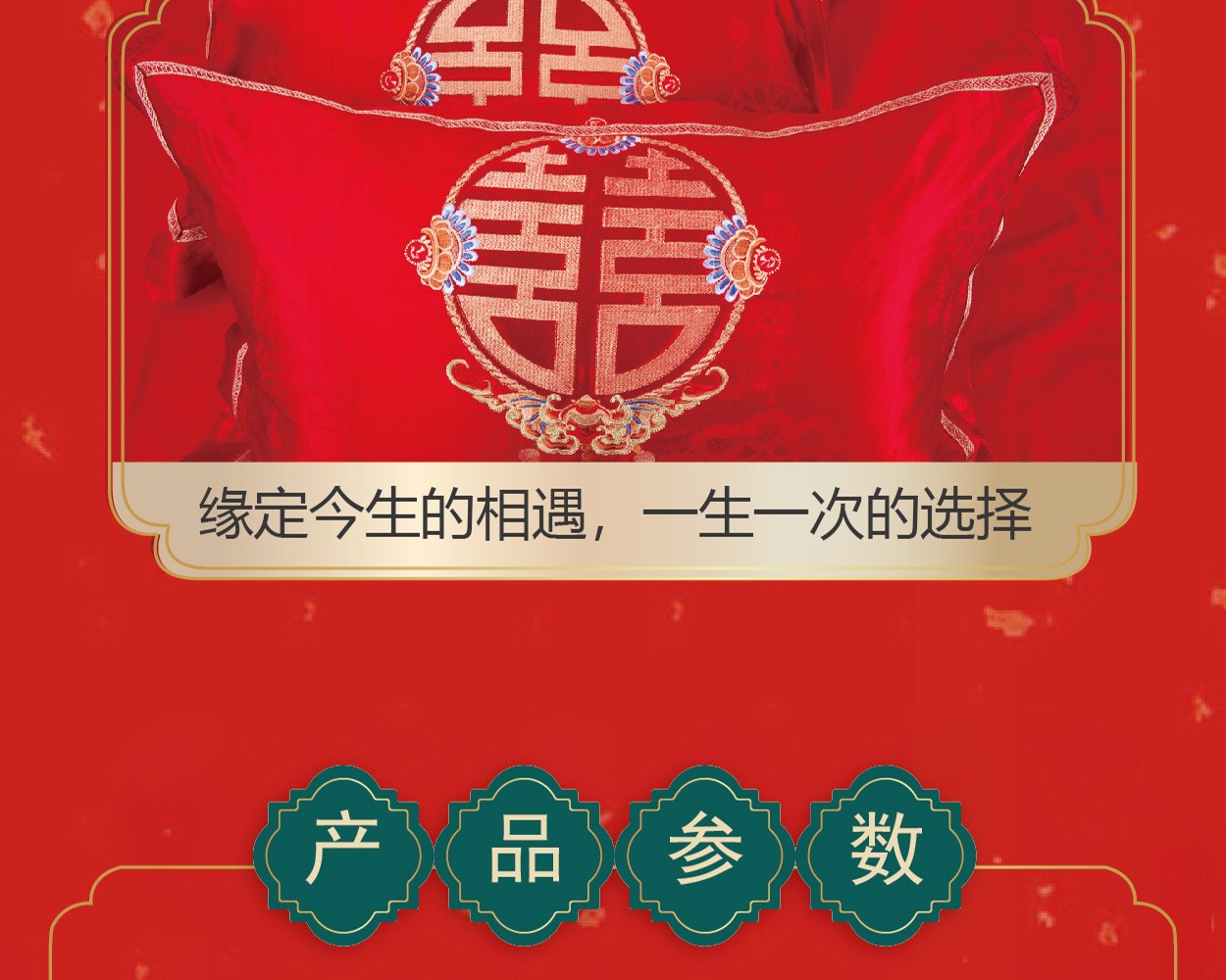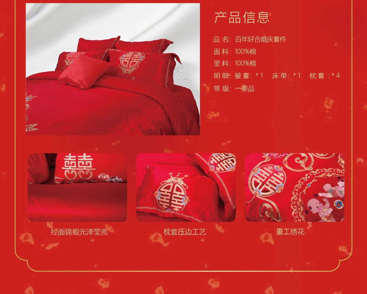 描述:中国风婚庆四件套,设计融入传统婚庆意象,吉祥纹案承载着一生的祝福,寓意婚姻幸福甜蜜,100%选用优质新疆长绒棉编织而成,比起普通全棉四件套具有缩水率低,不易掉色,更加柔软亲肤等特点,高支高密的双色立体提花工艺,加上写实的表现手法,让图案表现的更加细腻生动。
