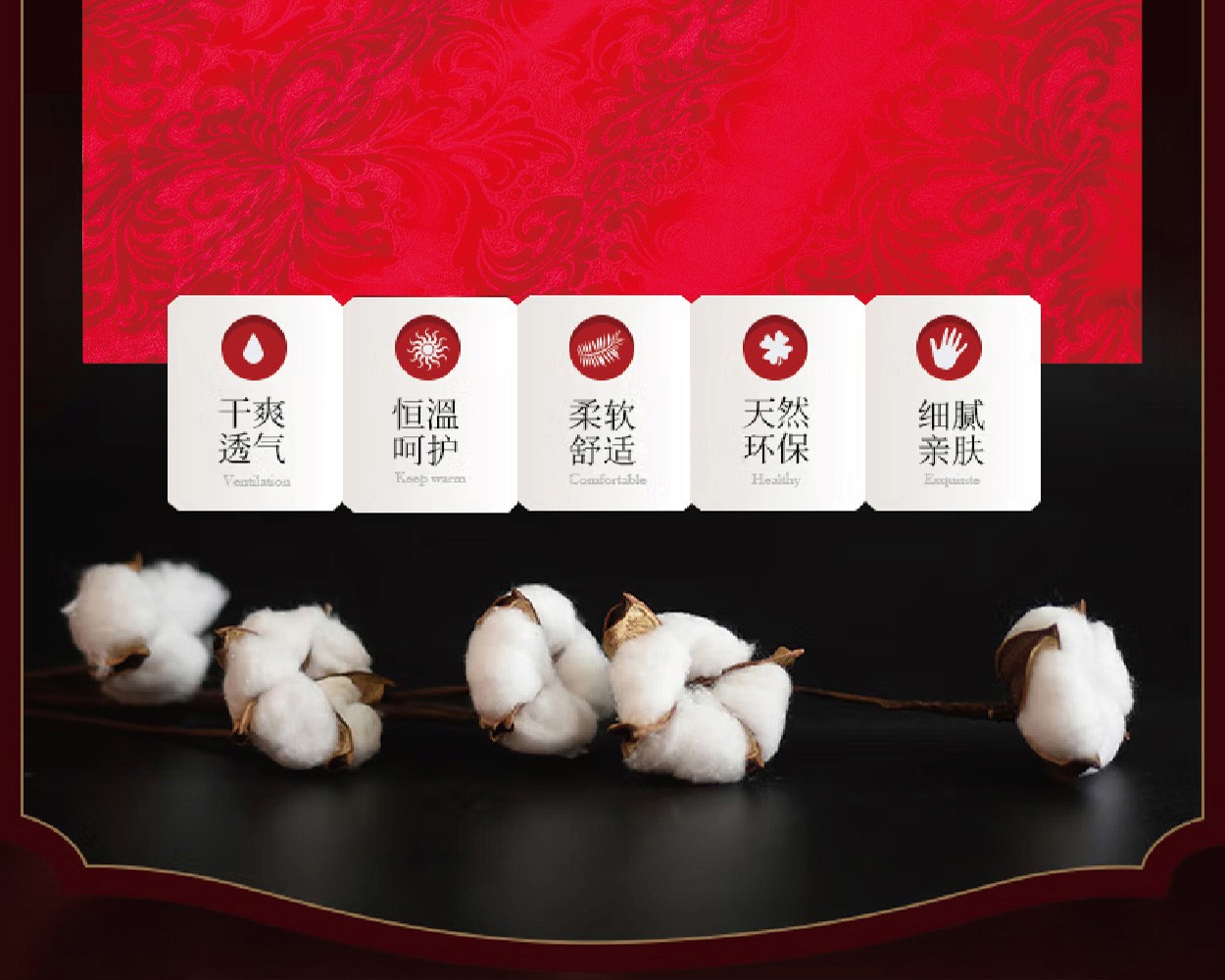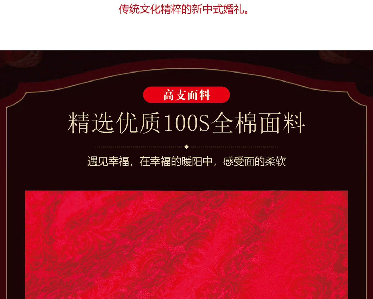 描述:红色是传统中国婚礼当中广泛运用的颜色,象征着喜庆、热闹,同时,红色还意味着爱情的如火如荼。大红喜庆风婚庆四件套,设计融入传统婚庆意象,添加了中国人喜爱红双喜、喜鹊等国粹元素,寓意着上天对婚姻的见证和祝福。