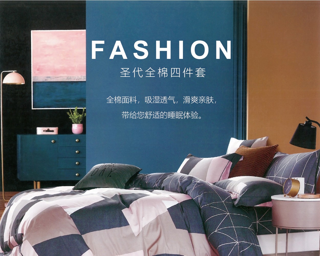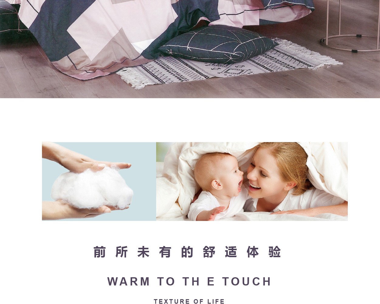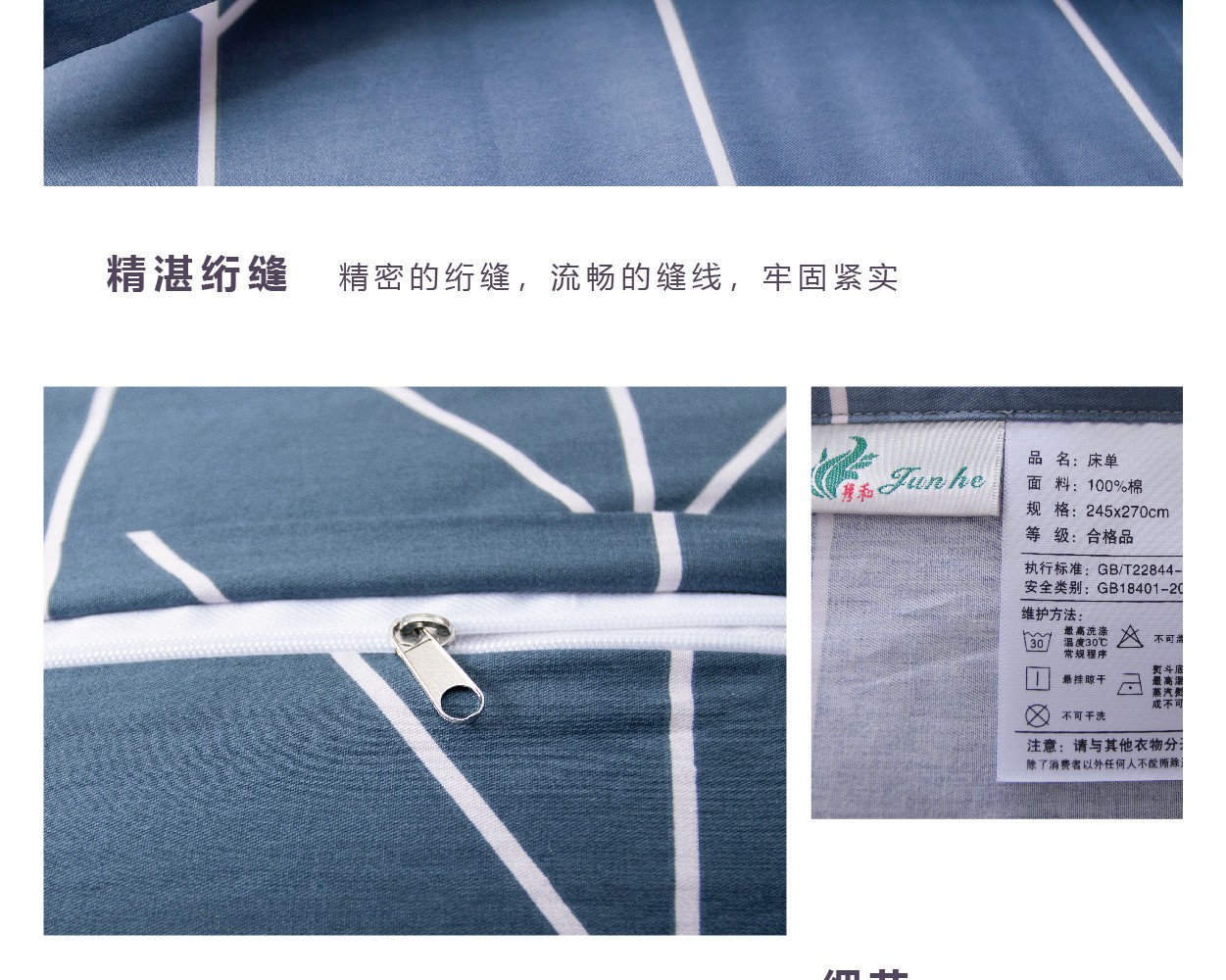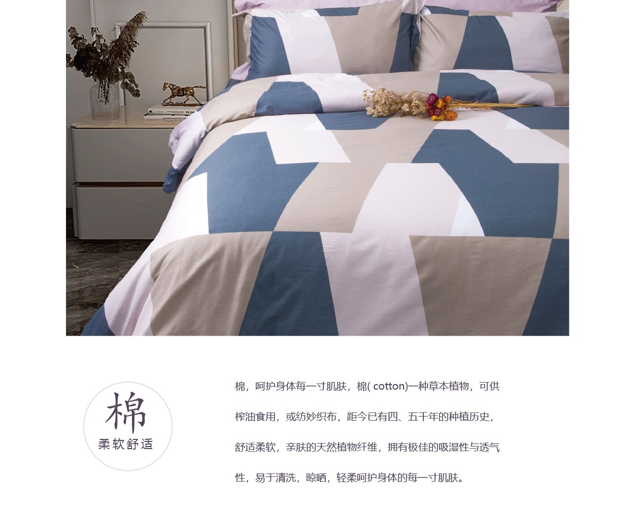 描述:100%纯棉面料、活性印花工艺、不脱色不掉色、健康环保 全工序纯棉精织,柔软舒适,吸湿透气,带给您舒适的睡眠体验。
