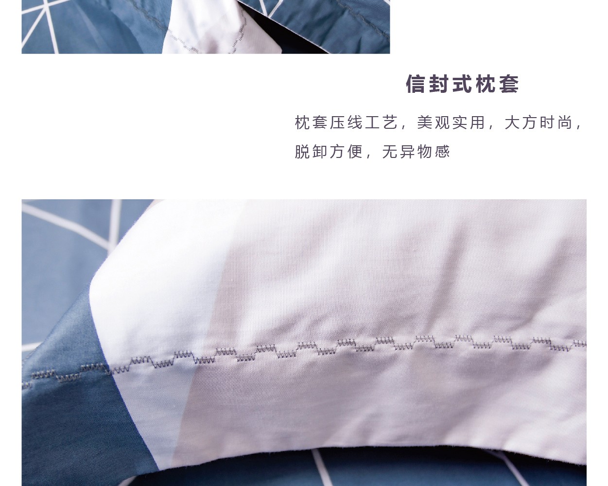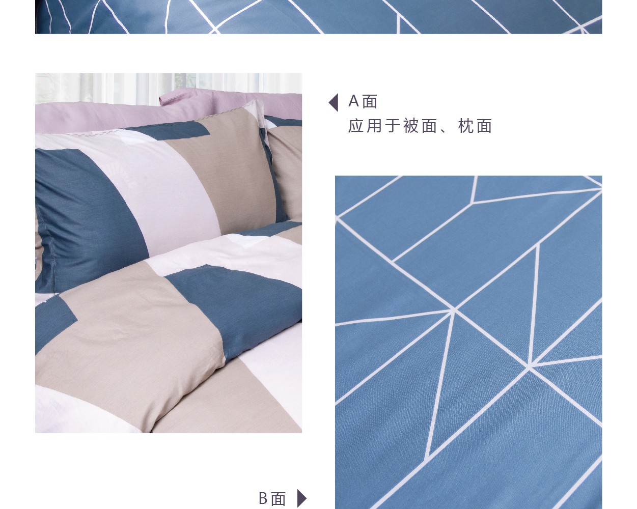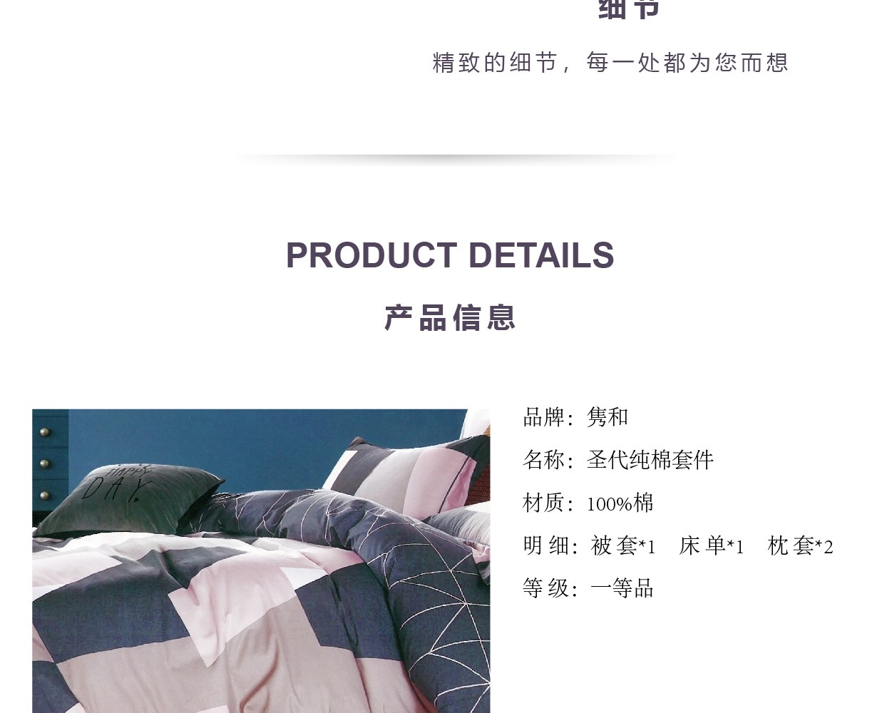描述:100%纯棉面料、活性印花工艺、不脱色不掉色、健康环保 全工序纯棉精织,柔软舒适,吸湿透气,带给您舒适的睡眠体验。