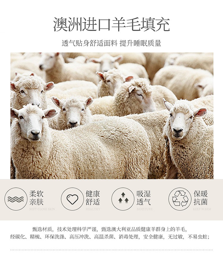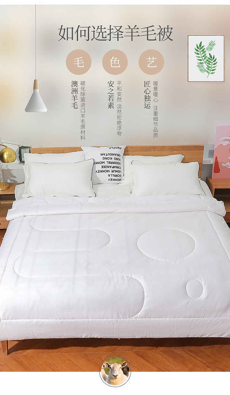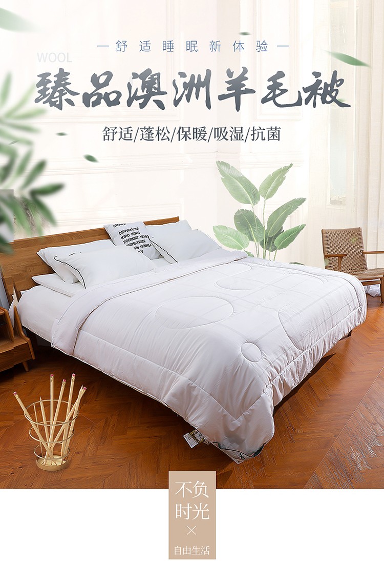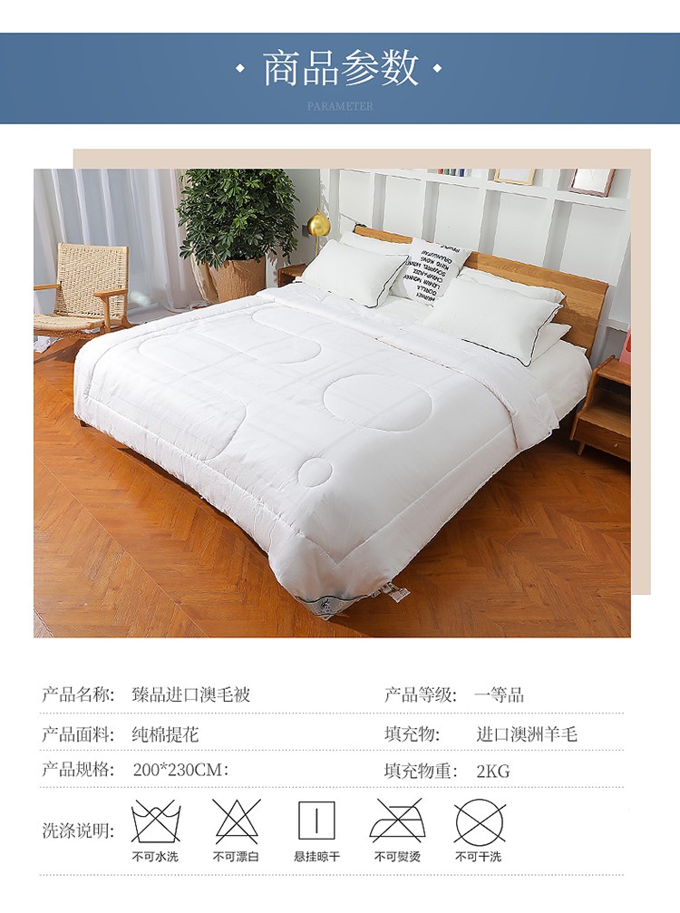 描述:进口澳毛填充,提花被套加花边工艺,看上去高档大气!保暖透气舒适
