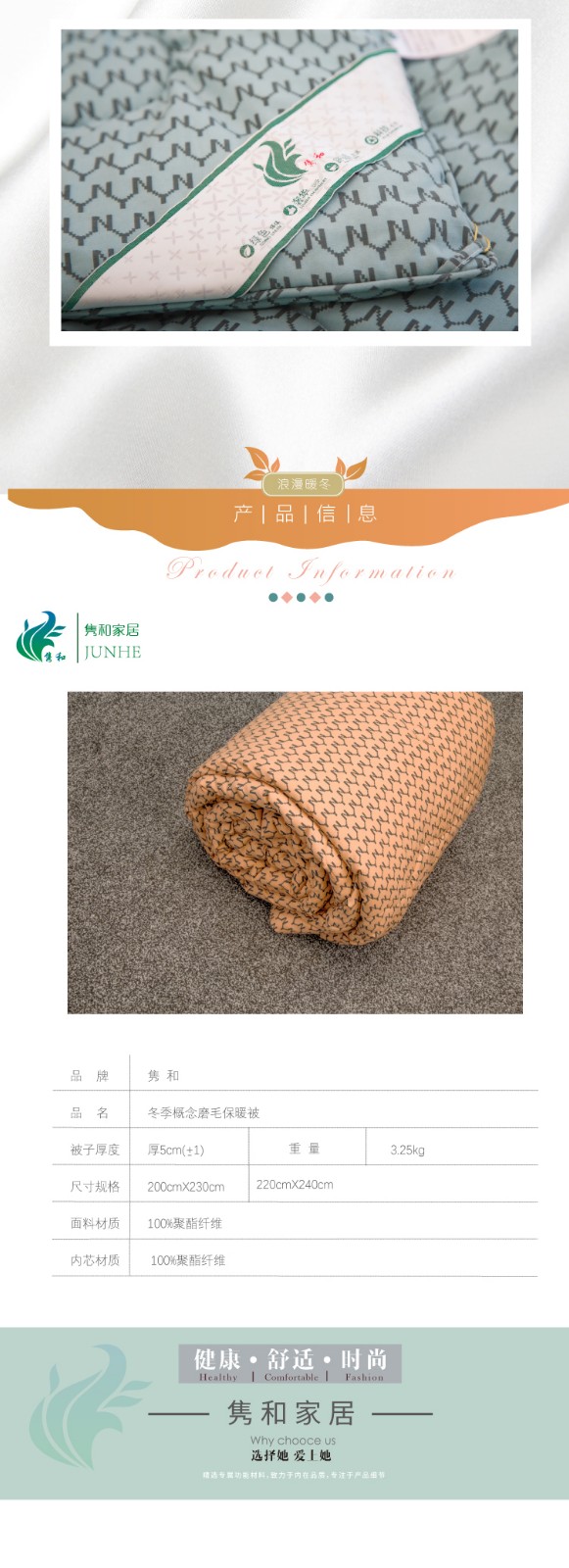 描述:100%聚酯纤维棉,大方设计,时尚两色任选 优质环保印染工艺,无任何甲醉,增白剂,更健康,跟保暖,更实惠