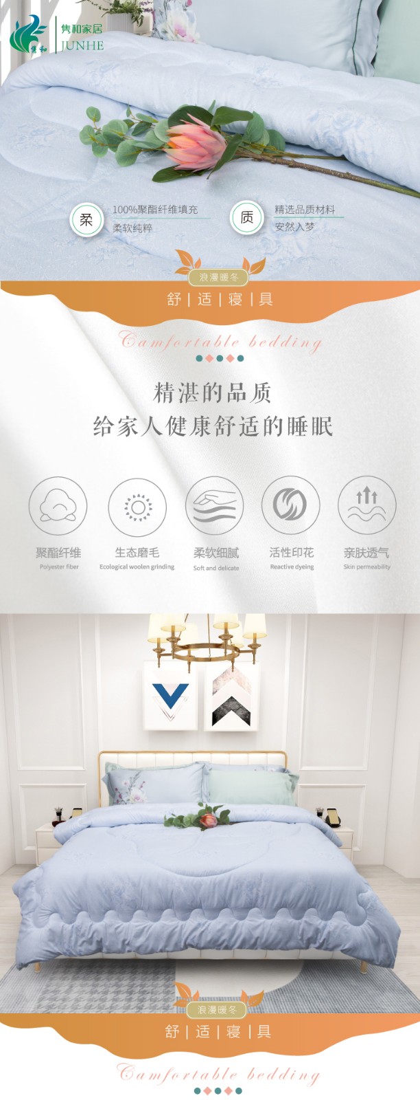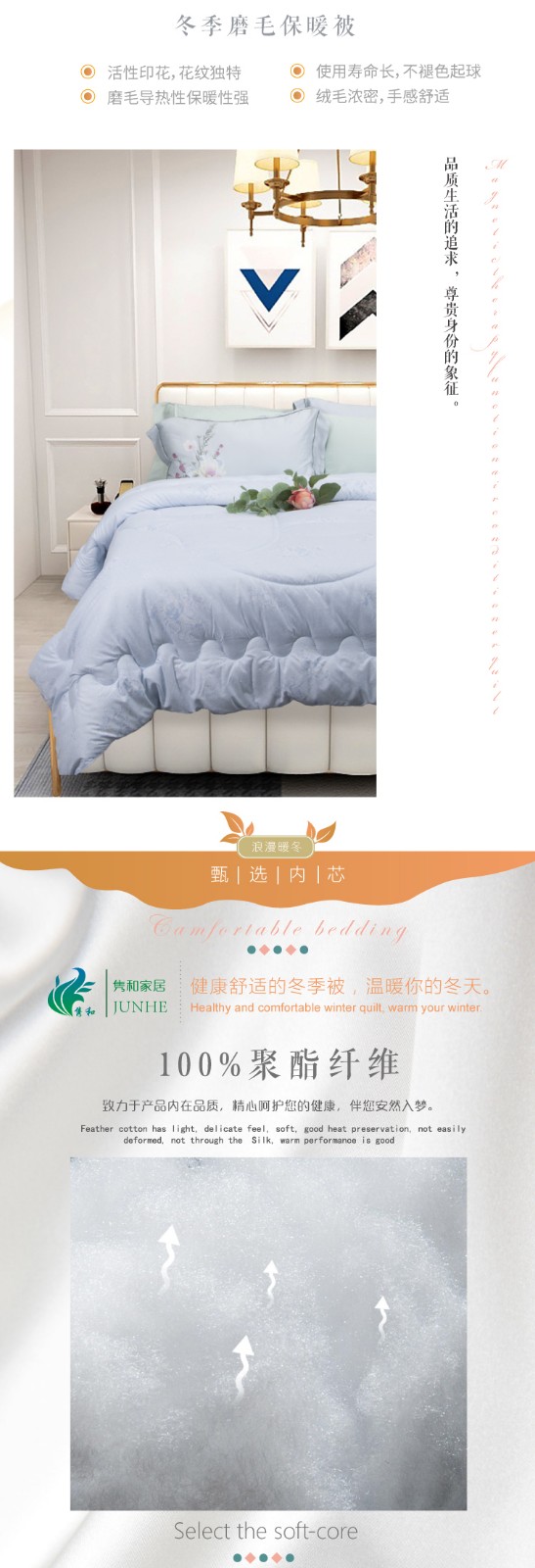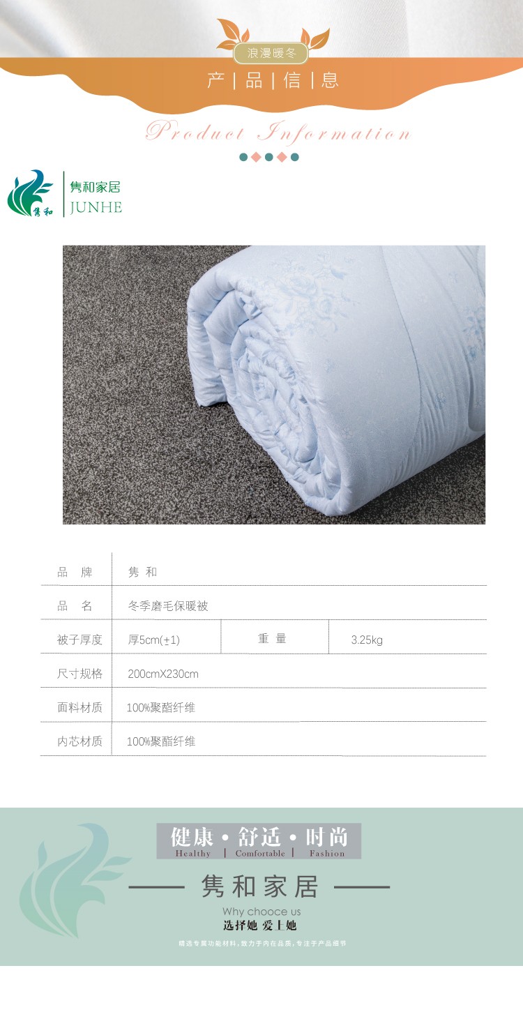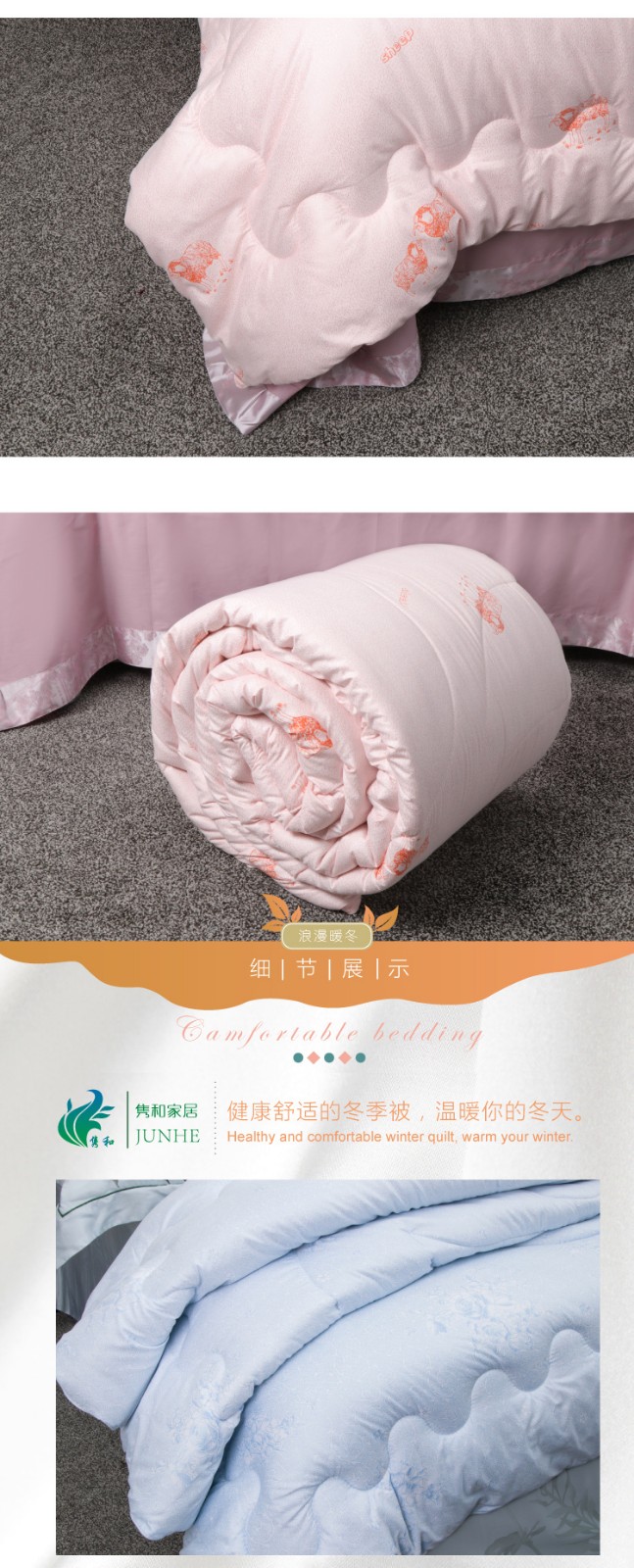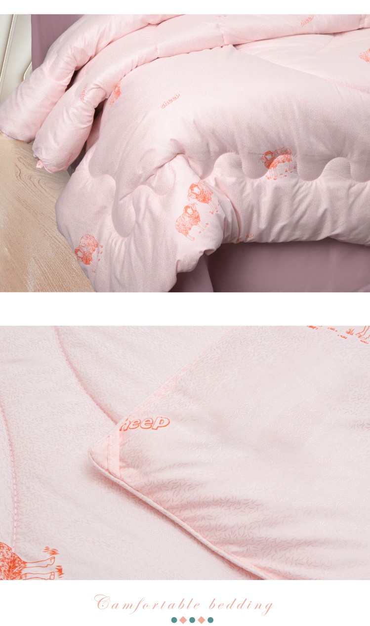 描述:被芯全7孔棉填充,活性印花工艺、绿色健康、色牢度高、舒适耐用、精湛绗缝、大方边角设计、保暖又大气,两色任选