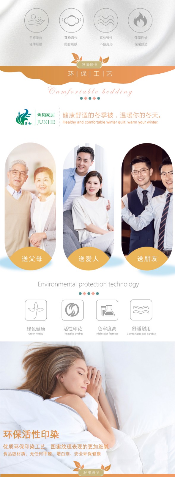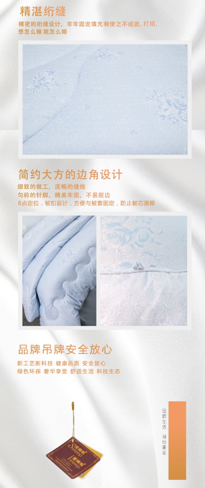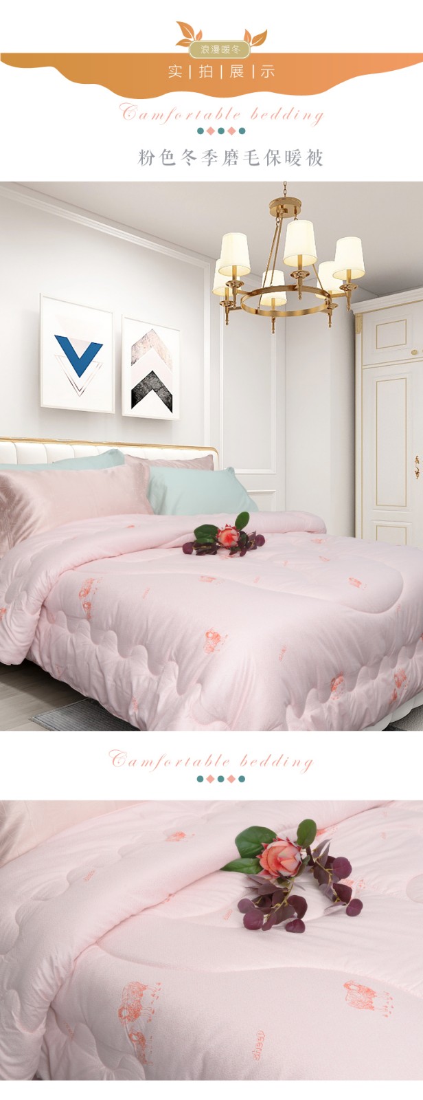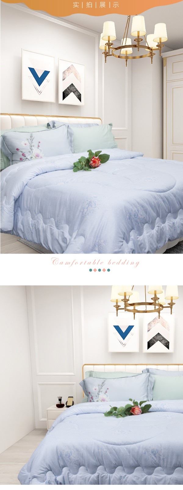 描述:被芯全7孔棉填充,活性印花工艺、绿色健康、色牢度高、舒适耐用、精湛绗缝、大方边角设计、保暖又大气,两色任选