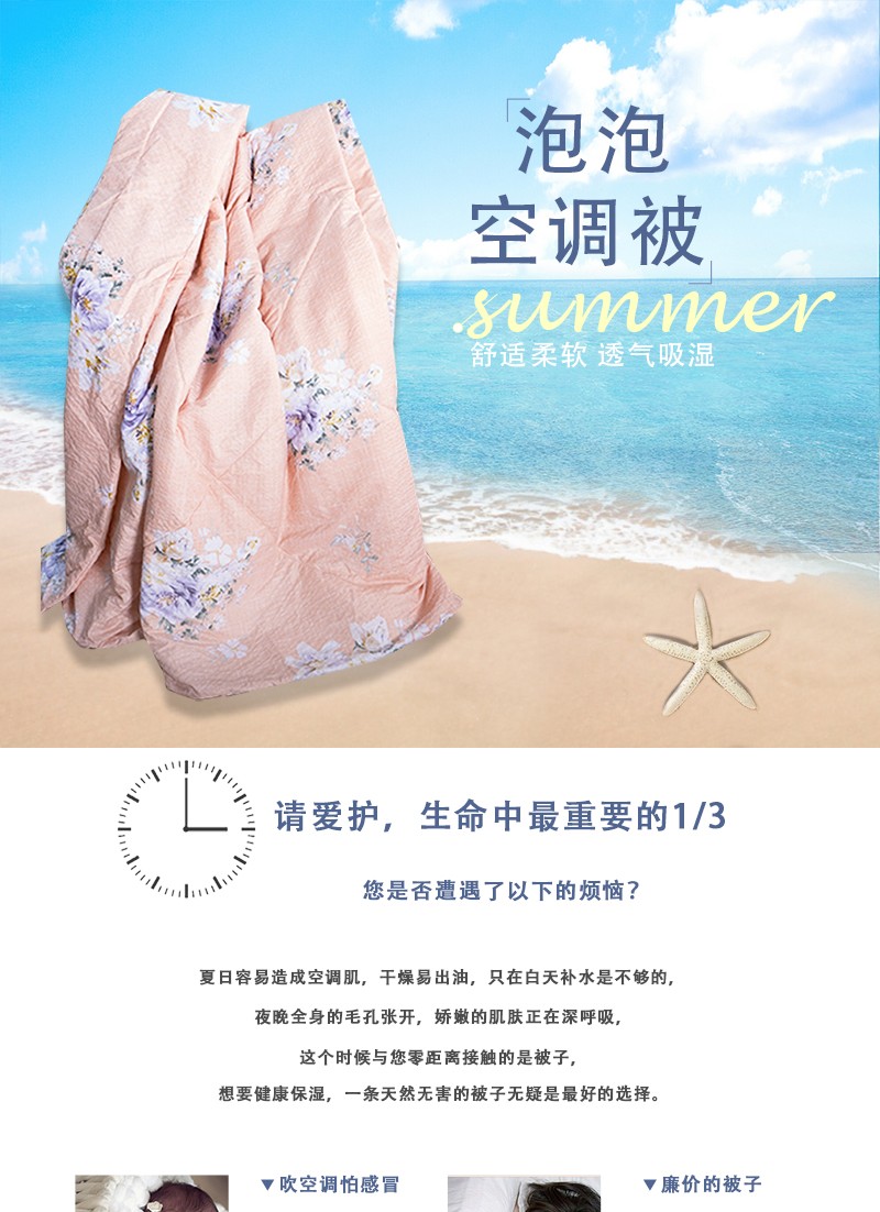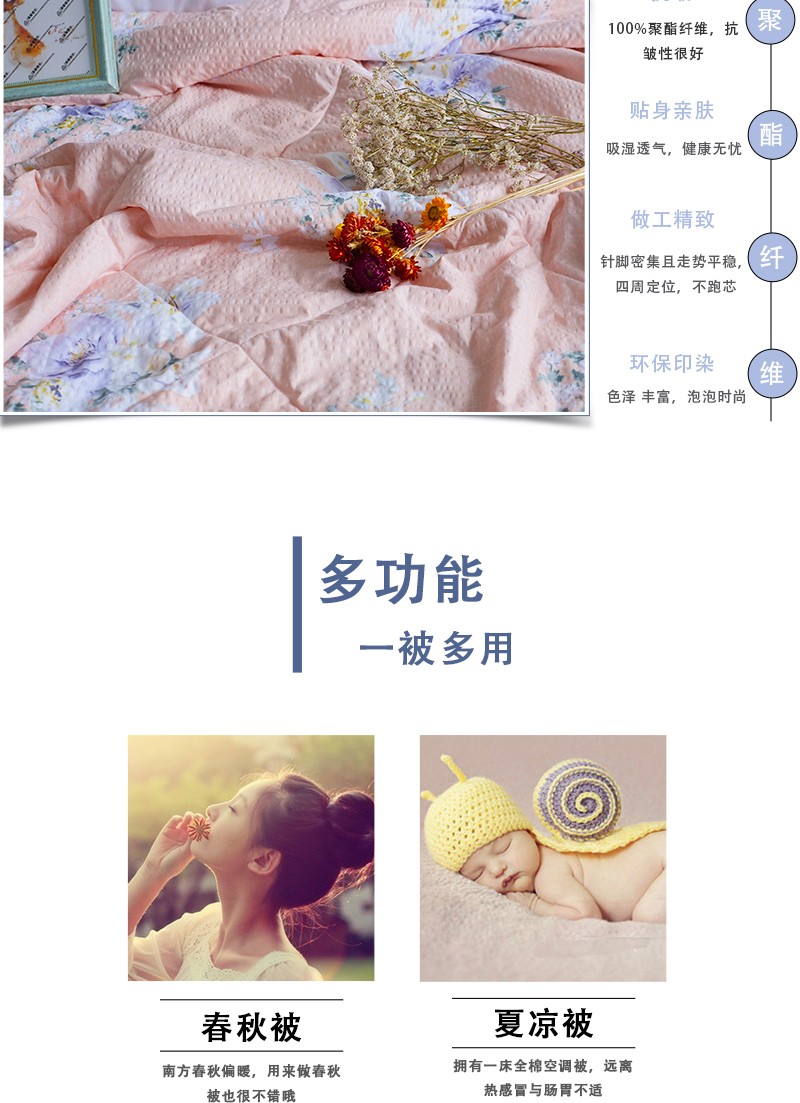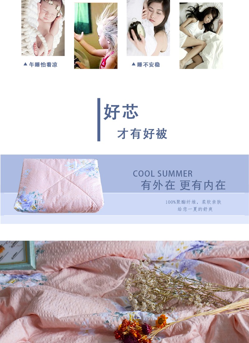 描述:具有泡泡的特殊外观风格,呈现出均匀密布凹凸,不仅抗皱性强,而且透气性好 优质羽丝棉填充,加上健康环保的印染工艺,让你的睡眠更加健康舒适