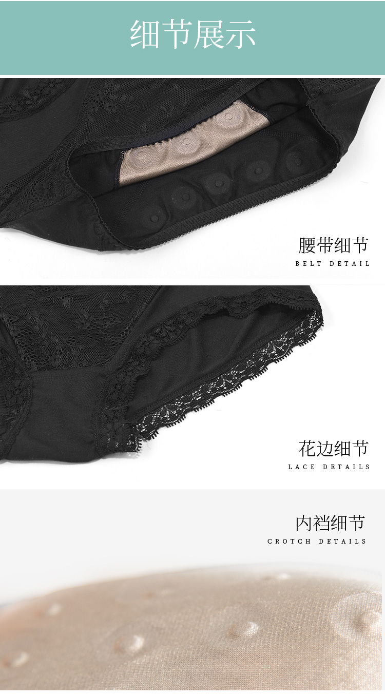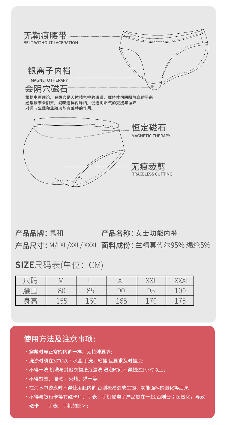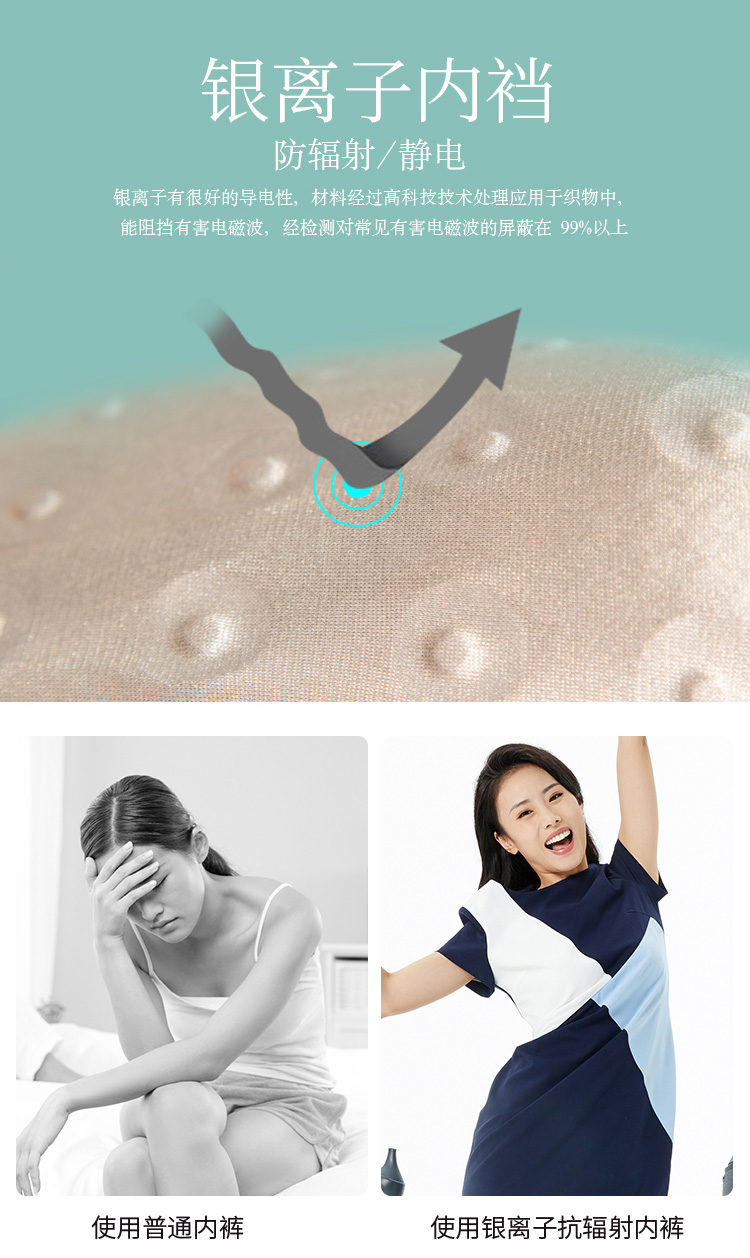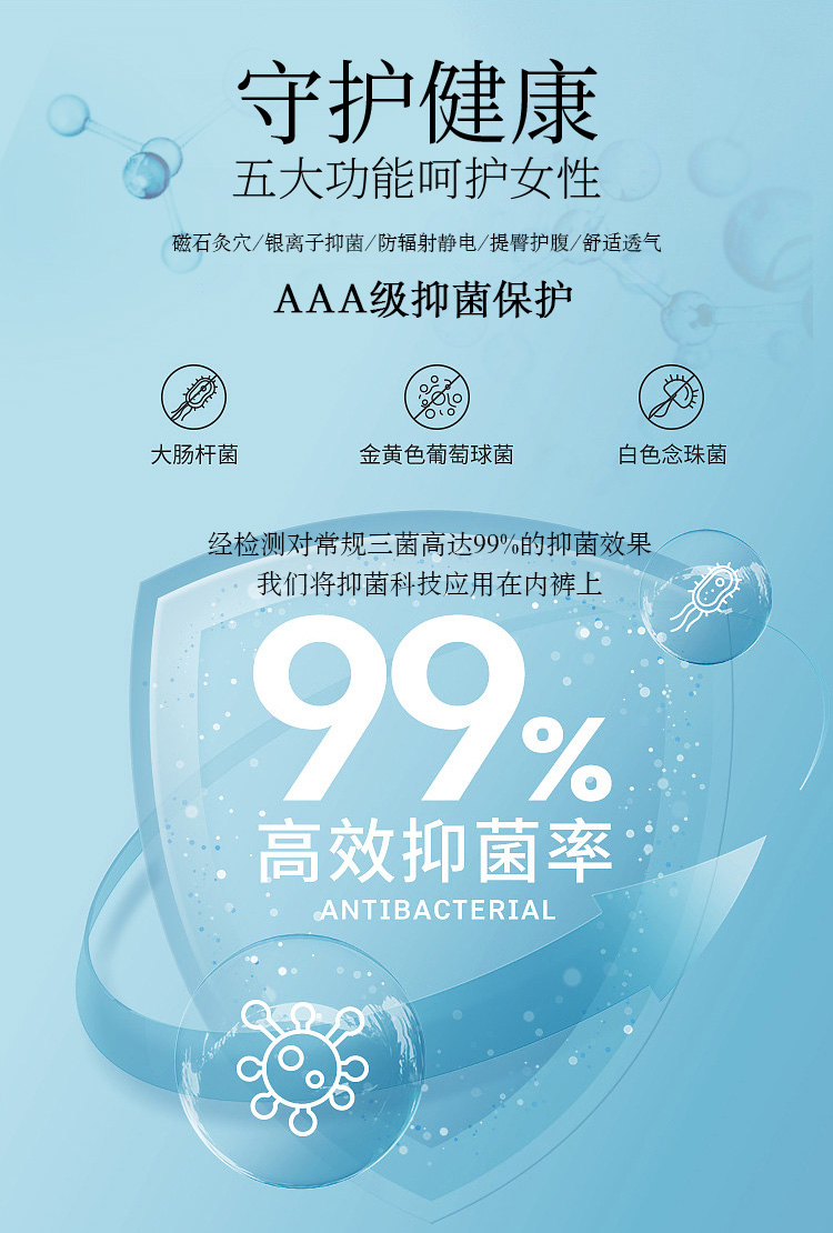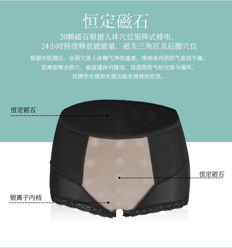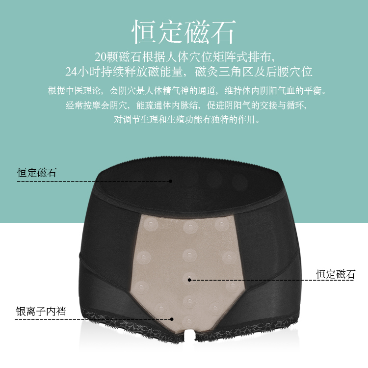 描述:精兰莫代尔面料.内镶18颗生物磁片,24小时释放磁能量,更有银离子抑菌、防辐射、舒适透气,再也不用担心例假的痛苦,呵护女性每一天