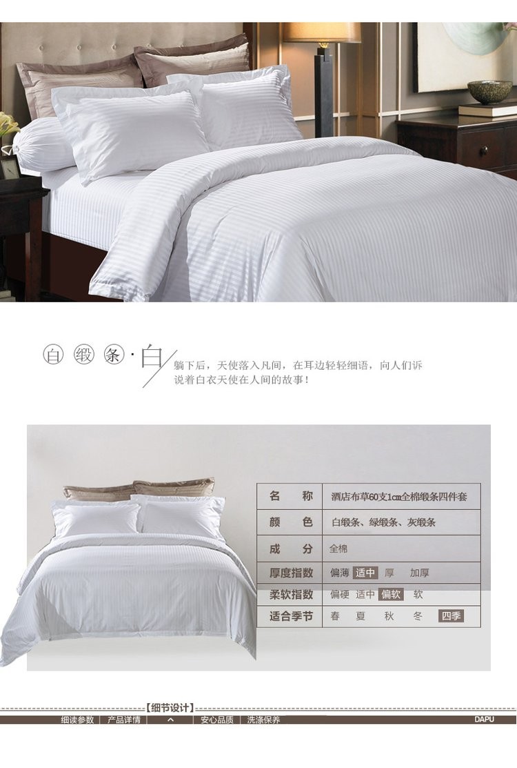 描述:本公司为客户提供各种酒店布草,多种款式、支持来图定制,均是全工艺一手品牌面料,细致考究的工艺,富裕每一个床品细腻如绸的柔软触感。