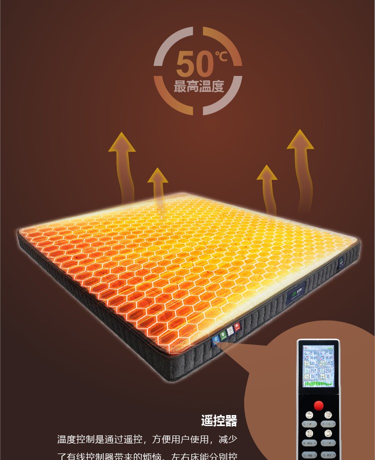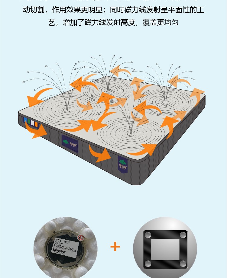 描述:床垫采用旋磁发射器、恒定能量磁场层、石墨烯发热层、负离子释放层、高密度棉等多层复合材料结构,床垫左右分区,可自由在旋磁和静磁方面调节。石墨烯电离子快速加热至人体舒适温度38°C。温软好床垫、不仅睡得舒适,还能发射磁及远红外负离子、让你在睡眠中被动养生,尽情享受好睡眠。